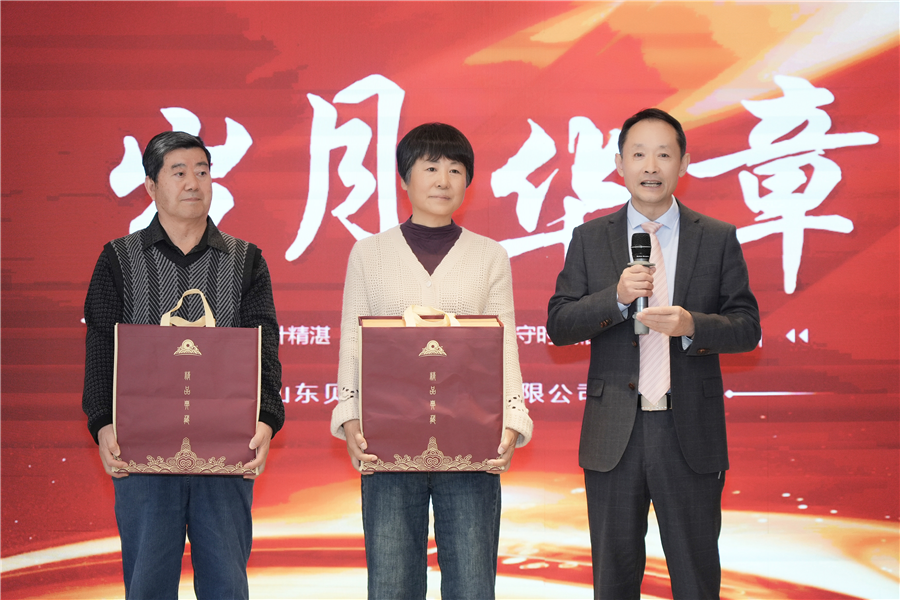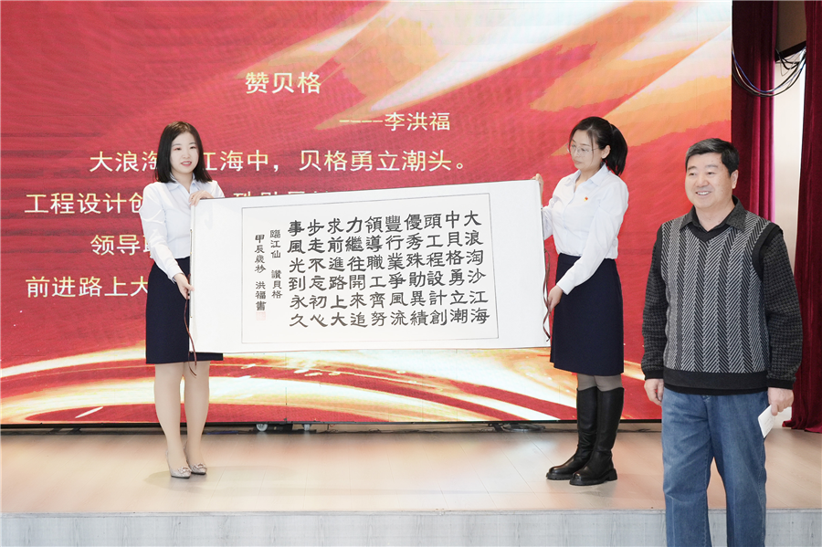 作為貝格退休員工代表李洪??偣槲覀儙砹嗽娫~--《贊貝格》,公司也為李洪??偣ぁⅠR恒香總工準備了退休紀念品。